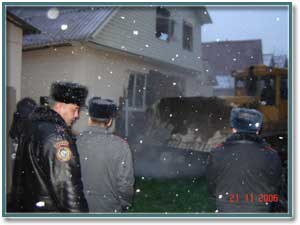 На следующий день, 21 ноября, примерно в 13.00 дачный поселок, где проживает около двухсот членов “Общества сознания Кришны” был блокирован полицейскими, а в сам поселок въехало два автобуса с ОМОНом (скорее всего “братская помощь” властей Алматы). Туда же одновременно въехало несколько бульдозеров, в сопровождении судебных исполнителей и работников акимата. Руководил уничтожением поселка и установлением полицейской блокады человек, в котором многие признали самого акима Карасайского района.