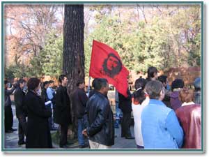Возложив цветы участникам установления советской власти в Семиречье, небольшая колонна протестующих направилась к зданию администратора судов города Алматы. Возглавляли ее соцсопровцы с красным знаменем, на котором был изображен Че Гевара. На месте пикета его участники развернули транспаранты. Самые большие были “На ваши отряды – народная армия” и “Вашим мобильным отрядам – наше народное ополчение”.
