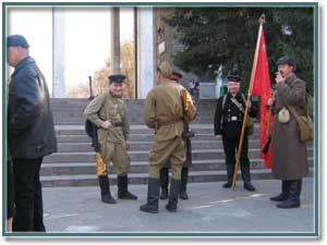 Отдельную колонну составили ветераны Великой Отечественной войны, пришедшие отметить 66-ую годовщину парада на Красной площади в Москве, с которого части уходили в бой на передовую. С ними пришли несколько человек из клуба военной истории. Красноармейцы, краснофлотец и комиссар в форме 1941 года сильно добавили живописности общей картине. Жители сносимых домов попросили у “костюмированных” пулемет Дегтярева или автомат ППШ, но поскольку патронов не было, от вооружения отказались.