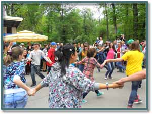 Под популярную и народную музыку танцевали и современные танцы, и народные – казахскую кара-жоргу, русские народные, украинские танцы под зажигательную песню “Ты ж мене пiдманула”, кавказскую лезгину. Многие включались в танцы, все остальные с улыбками на лицах собрались в круг и хлопали в такт. В какой-то момент появились сотрудники администрации, пытавшиеся выяснить: от какой организации действо? – Как оказалось, ни от какой, “просто празднуют”. “Парковские” администраторы поначалу несколько озадачились, но затем под воздействием общей теплой атмосферы, заулыбались и скороговоркой дали свое “парковское” добро (которое, в общем-то, никто и них и не спрашивал).