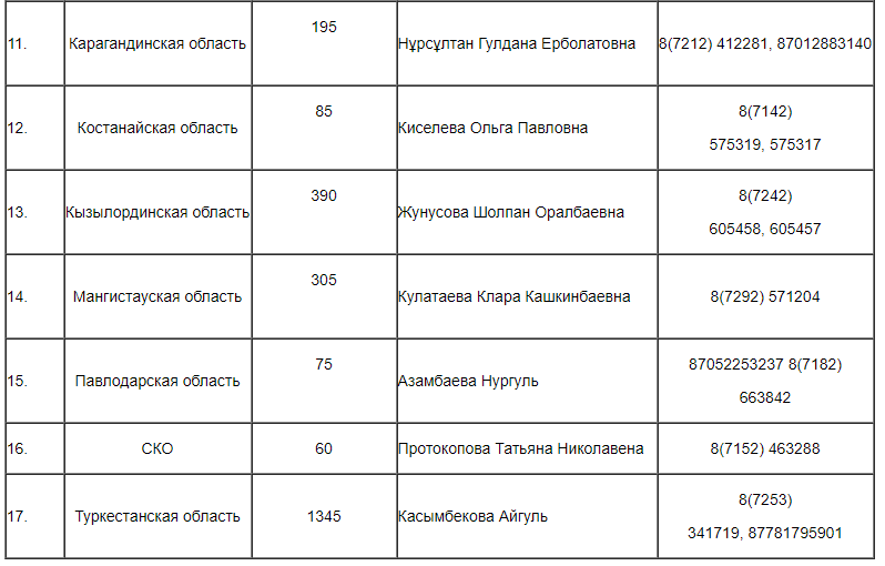МИА КазТАГ прилагает таблицу по количеству дополнительных грантов в разрезе регионов с указанием ответственных лиц и их контактов: