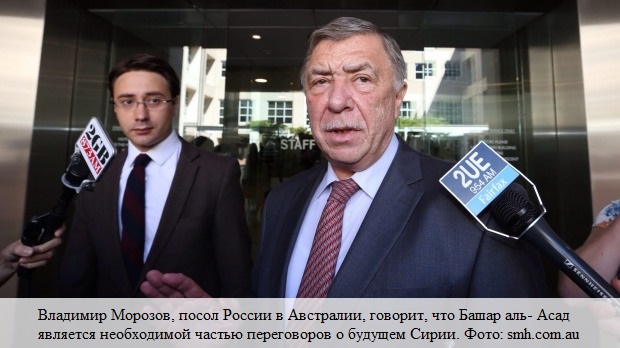 Комментарии господина Морозова появились после сообщений Fairfax Media о том, что посол говорил другим иностранным дипломатам в Канберре о предполагаемой готовности Москвы рассматривать уход Асада в рамках достижения компромисса по Сирии.