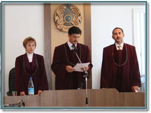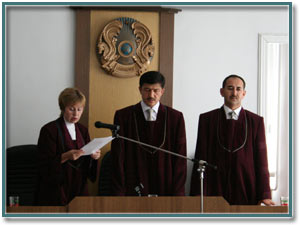 Вчера в Талдыкоргане в Алматинском областном суде был оглашен приговор десятерым подсудимым по делу об убийстве Алтынбека Сарсенбаева, Василия Журавлева и Бауыржана Байбосына. С 10.00 оглашение приговора было отложено из-за неявки адвокатов подсудимого Рустама Ибрагимова, Нурлана Устемирова и Серика Сарсенова до 11.00, затем еще раз отложили на неопределенное время. С утра в здание суда не пропускали многих журналистов — это были телевизионщики и фотокорреспонденты. Но немного позже вышел один из главных полицейских и объяснил нам, что сейчас готовится зал, где идет сам процесс, и во время приговора мы все сможем снимать, как и обещал председательствующий судья Мерекенов.
